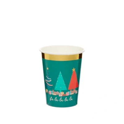 Traditional design with a contemporary twist Fa La La La La party range, ideal for Christmas parties and family get togethers. Festive green paper cups with a contemporary Christmas tree print and a stylish foil finish. Capacity: 250ml Material: Paper Pack of 8, Manufacturer: Amscan