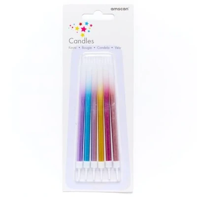 Girls really do rule with this colourful, iridescent party range. Rainbow ombre cake candles with a glittery finish. Each measures 13cm. Pack of 6, Manufacturer: Amscan