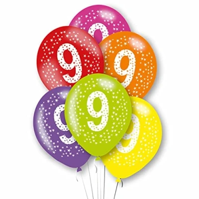 An assortment of primary colour balloons with a large '9' and starry print design. Simply pair with complimentary foil balloons to create a stunning balloon bouquet. Suitable for helium or air inflation. 6 pack PLEASE NOTE: Bright mixed coloured balloon pack. Colours may vary from packaging and image shown., Manufacturer: Amscan
