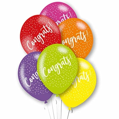 An assortment of primary colour balloons with a 'Congrats!' message and confetti style print. Simply pair with complimentary foil balloons to create a stunning balloon bouquet. Suitable for helium or air inflation. Each balloon measures: 11" 6 pack, Manufacturer: Amscan