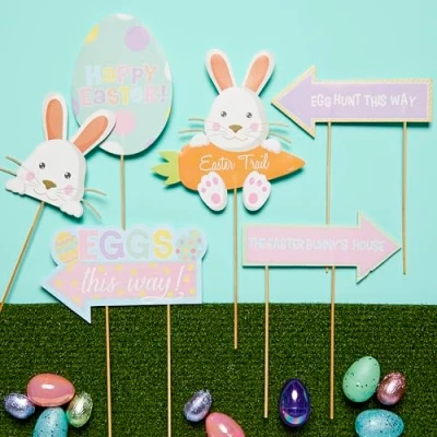 AmazonCreate the ultimate Easter egg hunt with our set of fun signs The signs are a mixture of cute bunnies, eggs, carrots and 'This Way' messages Each made of cardboard Wooden poles included Pack includes 6 signs in various sizes, Manufacturer: Amscan