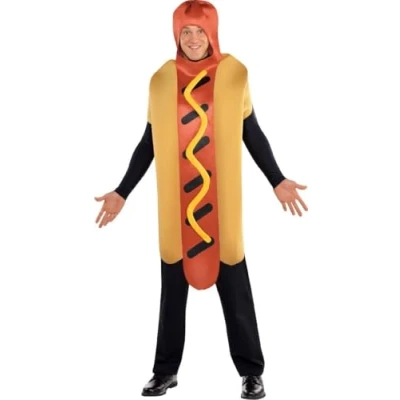 Hot Diggerty Dog is a fun one piece padded tunic shaped like a hot dog bun! The hotdog is completed with a shiny mustard swirl print. A face cut-out and armholes complete this silly costume Size: Extra Large Once you’re done with this fun costume, please consider re-gifting or giving to charity to give it a new life., Manufacturer: Amscan