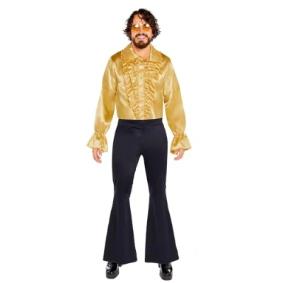 Gold satin ruffle shirt ideal for 1970's themed parties or festivals Packet includes: Shirt Size: Small Once you’re done with this fun costume, please consider re-gifting or giving to charity to give it a new life., Manufacturer: Amscan