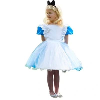 Package includes 1 Alice Costume. Let's chase a rabbit through the hole in this Blue Alice in Wonderland Costume with Headband! This costume features a blue bodice with an attached white apron and blue and white tulle skirt. It also comes with a black headband. A cool, cute, fun costume, that can be used for occasions such as birthdays, role-plays, themed parties, or other special events. It is a colorful and beautiful costume made of quality fabrics that is comfortable for your little one., Manufacturer: amscan