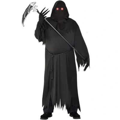 Package includes 1 Reaper Costume Our Red Eye Reaper Costume includes this full length black robe which has a jagged hem, a tie around belt and accessorised with a pair of black gloves with elongated pointed fingers and a full face mask with a red light up LED eyes A scary costume perfect for Halloween, Birthday Parties or any themed parties This costume comes with the robe, belt, mask, gloves and light up LED eyes for a complete and ready to wear set