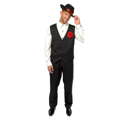 Transform into the ultimate gangster man with this handy 3 piece costume set. White shirt with attached mock pin stripe waistcoat, matching pin stripe trousers and the 1920's hat with red trim completes the look. Packet includes: Shirt with mock waistcoat, trousers and hat. Size: Extra Large Once you’re done with this fun costume, please consider re-gifting or giving to charity to give it a new life., Manufacturer: Amscan