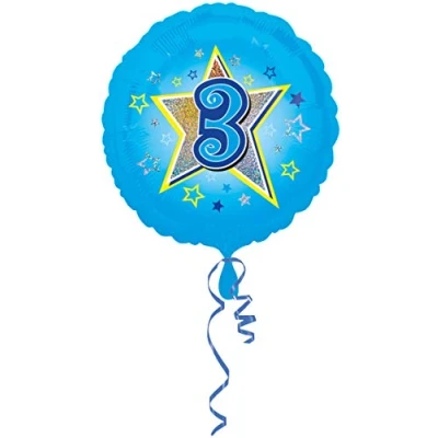Package includes: 1 x blue 3rd birthday round foil balloon Product features a foil balloon with a number "3" infront of an iridescent star against a blue background. Perfect for birthday celebrations. The item is made of foil., Manufacturer: amscan