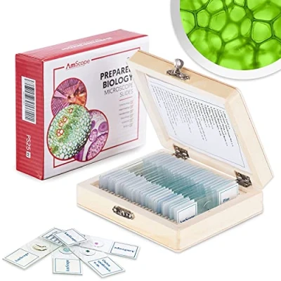 AmScope Boxed Set of 25 Glass Prepared Microscope Slides in Wooden Box Includes Plant, Fungus, Insect, & Mammal Specimens