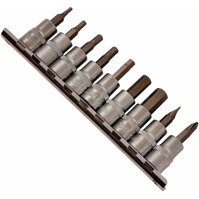 General description Drop forged sockets with chrome vanadium steel bits, designed for durability and strength. This 10-piece set is ideal for various applications, providing a reliable solution for your DIY and home improvement needs. Technical specifications Drive size: 3/8" Hex bits included: 3mm, 4mm, 5mm, 5.5mm, 6mm, 8mm, 10mm Additional bits: Slotted 6mm, Phillips #2 Compatibility and accessories Complete with storage rail for easy organization