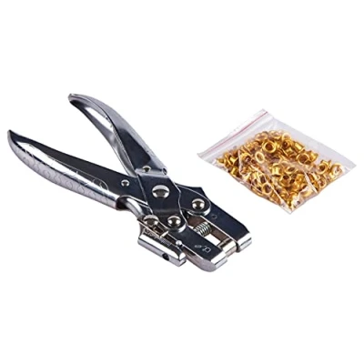 ManoManoGeneral description Heavy duty chrome plated eyelet plier designed for durability and ease of use. This tool is perfect for creating eyelets in various materials. Technical specifications Eyelet inner hole diameter: 4.5 mm Maximum material thickness: 2.0 mm Supplied with 100 electro plated brass eyelets Compatibility and accessories Suitable for use with card, leather, fabric, PVC, and more Other information Similar items: B1420, B1400, B1450, B1460