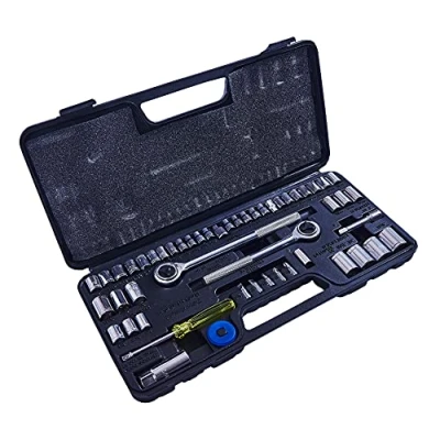 DURABLE: This 52 piece socket set is made from strong, triple chrome plated and hardened steel for durability CONTENTS: It includes a useful assortment of 1/4", 3/8" and 1/2" drive sockets CARRY CASE: It is supplied in a sturdy, blow moulded storage case Contents: - 1/4" drive sockets: 12 x 6pt AF sockets: 5/32", 3/16", 7/32", 1/4", 9/32", 5/16", 11/32", 3/8", 7/16", 15/32", and 1/2" - 3 x 8pt AF sockets: 1/4", 5/16", and 3/8" 13 x 6pt metric sockets: 4, 4.5, 5, 5.5, 6, 6.5, 7, 8, 9, 10, 11, 12, and 13 mm - 3/8" drive sockets: 3 x 6pt AF sockets: 7/16", 1/2", 9/16" 3 x 6pt metric sockets: 11, 12, and 13mm - 1/2" drive sockets: 4 x 6pt metric sockets: 16, 17, 18, and 21mm - 1 x 1/4" hex bit socket - 2 x slotted drive bits: 3/16", 9/32" - 3 x COMPACT FORMAT: Conveniently sized for storage in toolboxes and cabinets, Weight: 3.9242282636 pounds, Manufacturer: DK Tools