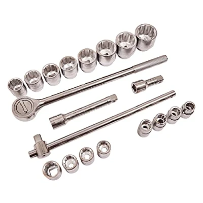 ManoManoGeneral description Drop forged and chrome plated, this 20-piece 3/4'' socket set is designed for durability and performance. It includes a comprehensive range of sockets suitable for various applications. Technical specifications Socket sizes: 19mm, 21mm, 22mm, 23mm, 24mm, 26mm, 27mm, 30mm, 32mm, 34mm, 36mm, 38mm, 41mm, 46mm, 48mm, and 50mm Includes: 1 x 450mm Sliding T-bar, 1 x 490mm Ratchet handle, 1 x 100mm extension bar, 1 x 200mm extension bar