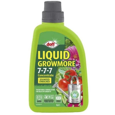 General description Doff Liquid Growmore Concentrate is a balanced multi-purpose feed enriched with micronutrients, designed to support the healthy growth of all types of plants, whether indoors, outdoors, or in greenhouses. Technical specifications Volume: 1 litre Fertilizer NPK: 7:7:7 Makes up to: 300 litres Compatibility and accessories Integral measure included