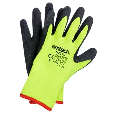 DURABLE: These high visibility, 10 gauge cotton/polyester thermal work gloves have tough latex coated palms with black crinkled palms for an excellent grip These large size site gloves are 10 gauge premium quality and feature thermal insulation for working in cold conditions. The Amtech N2376 winter gloves are officially size 9, and benefit from a black latex crinkle finish for excellent handling. Please note that these safety gloves are CE Complaint, indicating that they conform with health, safety, and environmental protection standards for products sold within the European Economic Area (EEA). This range of work gloves are available in Medium Size 8 (Amtech N2377), Large Size 9 (Amtech N2376) and Extra-Large Size 10 (Amtech N2375)