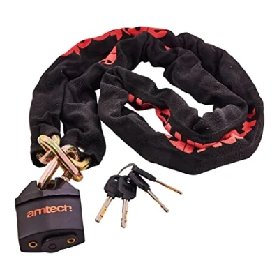 General description Heavy duty 9mm resistance welded square link chain designed for increased cut resistance. The chain features a weather-resistant zinc passivated finish and comes with a protective nylon sleeve to prevent marking. It includes a 65mm security padlock with a weather-resistant plastic body and is supplied with 4 keys. This product is ideal for securing motorbikes, bicycles, and other valuable items. Technical specifications Chain thickness: 9mm Padlock size: 65mm