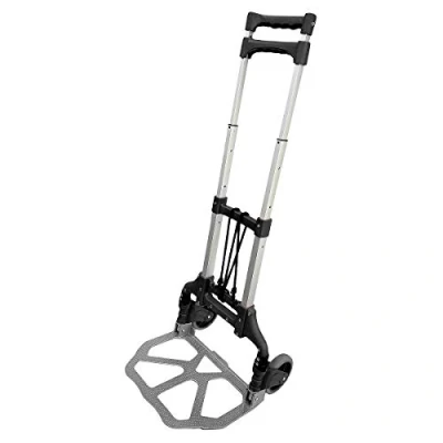 ManoManoGeneral description Lightweight foldable hand truck with an aluminium foot plate. This compact and maneuverable sack truck is easy to store and takes the strain out of moving boxes, cartons, and suitcases. Technical specifications Max height: 100 cm Handle telescopes from: 64 cm to 100 cm Foot plate size: 390 x 280 mm Wheel size: 130 x 30 mm Unfolded size: 420 x 380 x 1000 mm Folded size: 55 x 380 x 640 mm