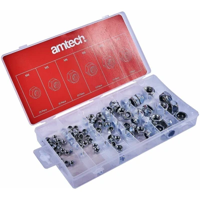 General description Nylon inserts prevent the nuts from loosening, making them ideal for high vibration applications. These locking nuts are zinc plated for corrosion resistance and come in a convenient plastic divider storage case. Technical specifications Contains sizes: M4 x 0.7mm M5 x 0.8mm M6 x 1.00mm M8 x 1.25mm M10 x 1.500mm M12 x 1.75mm