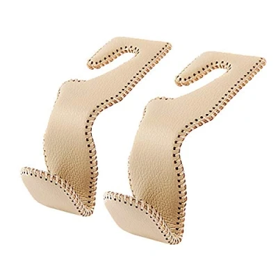 AMVOYOA Headrest Hooks for Purses and Bags, Car Back Seat Hanger Vehicle Beige Leather Storage Hook, Pack of 2