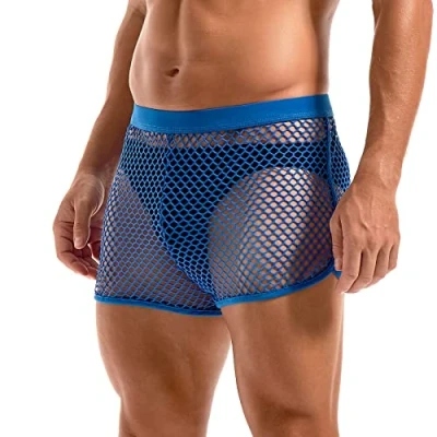 Amy Coulee Mens Fishnet Boxers Sexy Mesh Boxer Briefs Low Waist See Through Shorts Lounge Pajama Underwear Trunks (Blue, S)