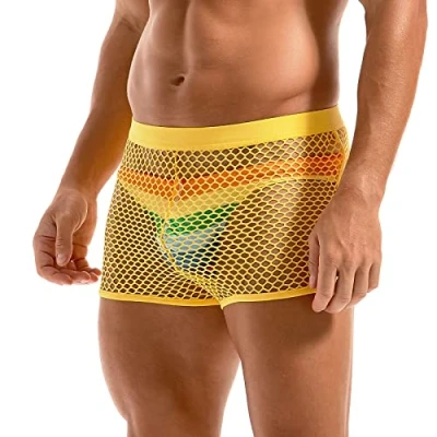 Amy Coulee Mens Fishnet Boxers Sexy Mesh Boxer Briefs Low Waist See Through Shorts Lounge Pajama Underwear Trunks (Yellow, XL)