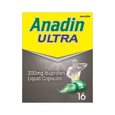 Boots9 Advantage card points. Anadin Ultra Liquid Capsules. Back & Muscle Pain. Lasts up to 8 hours.See details below, always read the labelSuitable for: Adults & children over 12 yearsActive ingredients: Ibuprofen 200mg FREE Delivery on orders over 45 GBP.