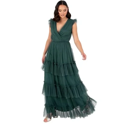 Evening Dresses for Women: Anaya with Love presents beautifully crafted evening gowns for women in regular and plus sizes Available in Frosty Green or Emerald Green and in 12 UK-EU sizes: 6 UK (34 EUR), 8 UK (36 EUR), 10 UK (38 EUR), 12 UK (40 EUR), 14 UK (42 EUR), 16 UK (44 EUR), 18 UK (46 EUR), 20 UK (48 EUR), 22 UK (50 EUR), 24 UK (52 EUR), 26 UK (54 EUR), 28 UK (56 EUR) Women's Maxi Dresses: The short sleeve maxi dress features a chic V-neckline formed by a faux wrap front An A-line design creates a flattering silhouette, while the maxi-length tulle skirt drapes gracefully to the floor with an elegant tiered ruffle detail A concealed back zip provides easy wear A-line Dresses: Feel comfortable in any situation in the A-line cut of this elegant dress The flowy skirt of the A-line dress allows for easy and comfortable movement Whether dancing or sitting, you will always feel cosy and relaxed An A-line dress will highlight your curves and will look great on all body types be it petite, regular or plus size Fabric Composition: These maxi dresses for women are consciously designed and crafted from 100% Recycled Polyester tulle, ensuring beautiful, sustainable occasionwear Made from recycled plastic, our luxury fabrics are lightweight and comfortable to wear, meaning you will feel great in whichever occasion dress you choose from the stunning Anaya with Love collection Wedding Guest Dresses for Women: This versatile dress is for a range of special occasions Whether you're looking for bridesmaid dresses, wedding guest attire, serving as maid of honour, or seeking the elegant dress for graduation, sixth-grade proms, formal evening gatherings, communions, christenings, Christmas parties, or even a maternity photoshoot, this stunning occasion dress fits the bill