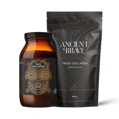 GRASS-FED, SUSTAINABLE BOVINE COLLAGEN POWDER. This grass-fed bovine collagen provides easily digestible, highly absorbable, clinically researched type 1 Hydrolysed collagen peptides. Type 1 collagen makes up 90% of the collagen in the human body and is a major component of skin, bones and cartilage. Ancient + Brave collagen is in the form of Hydrolysed peptides, which are a more easily absorbed form of 18 different amino acids, so your body can easily absorb the molecule as collagen. FREE FROM CHEMICALS, ADDITIVES + HORMONES. Sustainably sourced, grass-fed bovine collagen from European cows, derived primarily from the hides. The cows have been raised naturally without hormones, antibiotics, chemicals, or GMOs. The True Collagen is of the highest quality and purity and is Hydrolysed, making it highly absorbable, odourless and tasteless. As a company, we are committed to developing the best products sourced from environmentally conscious and sustainable suppliers. BENEFITS OF TAKING COLLAGEN. Collagen powder is a great addition to your anti-ageing ritual. When taken consistently it can support optimal daily wellbeing and hydrate from within. An excellent source of protein and nutritional sustenance to support fasting strategies. Additional benefits include supporting skin, hair & nails, bone health, muscle recovery and injury prevention, gut health and immune support. FOR AN OPTIMAL DAILY WELLBEING RITUAL. Take 5 to 10g daily of True Collagen. It is incredibly versatile and can be added to any hot or cold drink or food of your choice from your morning coffee or smoothie to soups and overnight oats. To truly nourish the skin from within we recommend 5g daily for normal skin types. Increase to 10g or more to support hormonal acne, dehydrated or prematurely ageing skin. PURE, POTENT, FOR THE PLANET. We put people and the planet at the heart of our business. Sourcing the best ingredients from environmentally conscious, sustainable and organic suppliers wherever possible is our priority. As well as the benefits to your own wellness, for every purchase, we support 1% For the Planet chosen charities. Climate Neutral and Certified B Corp, we continuously demonstrate our commitment to balance profit and purpose, becoming a brand you can trust.