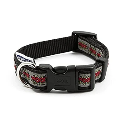 A bold 'Woof' applique inspired by classic comic book Quick-release buckle for speedy removal An adjuster to ensure your dog's collar is the perfect fit D-ring for easy lead attachment Long-lasting collar comfortable for your dog