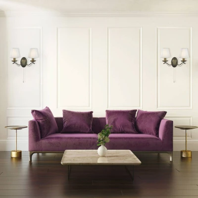 The Andretti wall lamp showcases a beautiful curved frame crafted from mild steel, which is elegantly coated in a stunning antique brass finish. This vintage-inspired design exudes sophistication and warmth, seamlessly fitting into various décor styles, from traditional to contemporary. The two cream-colored fabric shades add a touch of softness to the overall appearance, enhancing its inviting charm and providing a gentle diffusion of light.
