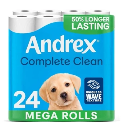 Mega, Soft and Effective Clean; 24 Andrex Complete Clean Mega Rolls Toilet Paper for an effective clean for you and your family 50 percent More Sheets: Mega loo rolls have at least 50 percent more sheets on every roll*, delivering the same great clean and Andrex quality while lasting longer Unique Texture: Embossed with a distinct 3D Wave texture, each soft sheet goes above and beyond to provide an effective, confident clean Bowel Cancer UK: To help raise awareness, our toilet tissue packaging features a QR code to direct you to more information about the key symptoms of bowel cancer
