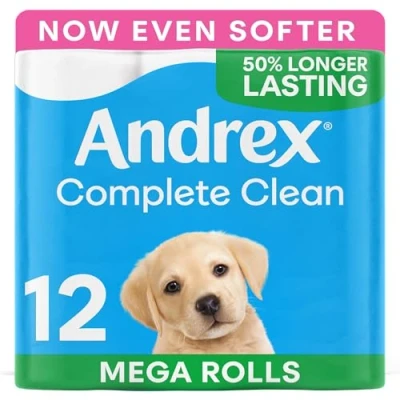 Mega, Soft and Effective Clean; 12 Andrex Complete Clean Mega Rolls Toilet Paper for an effective clean for you and your family 50 Percentage More Sheets: Mega loo rolls have at least 50 Percentage more sheets* on every roll, delivering the same great clean and Andrex quality while lasting longer Unique Texture: Embossed with a unique 3D Wave texture for an efficient clean and now even softer. Bowel Cancer UK: To help raise awareness, our toilet tissue packaging features a QR code to direct you to more information about the key symptoms of bowel cancer Pair for Extra Freshness: Experience a shower fresh clean by pairing Complete Clean Mega Rolls Toilet Tissue with our plastic-free Andrex Ultimate Fresh Hygiene Wipes Moist Toilet Tissue For a proven effective clean.
