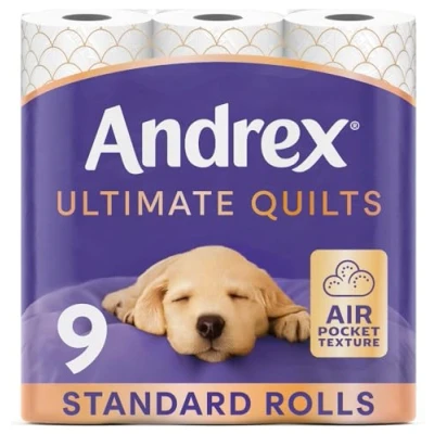 Our Most Comfortable Clean: 9 toilet rolls of Andrex Ultimate Quilts Toilet Paper for a premium, gentle clean for you and your family Ultimate Quilted Care for Skin: Toilet paper rolls embossed with our unique Air Pocket texture; each thick and super-soft sheet helps ensure a confident clean Luxurious and Comfortable Clean: Indulge in 5-star comfort every time you use Ultimate Quilts loo rolls, and feel good knowing the packaging is made with 50% recycled plastic Bowel Cancer UK: To help raise awareness, our toilet tissue packaging features a QR code to direct you to more information about the key symptoms of bowel cancerndrex Hygiene Wipes Moist Toilet Tissue Pair for Extra Freshness: Experience a shower fresh feeling by pairing Ultimate Quilts Toilet Paper with our plastic-free Andrex Hygiene Wipes Moist Toilet Tissue