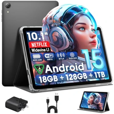 Android 15 Tablet 10 Inch with Case, 18GB RAM 128GB ROM, 1280 x 800 IPS HD Widevine L1, Octa Core, 1TB Expandable, WiFi 6, BT5.4, Dual Camera 5MP+8MP, 6000mAh, GPS, Speakers