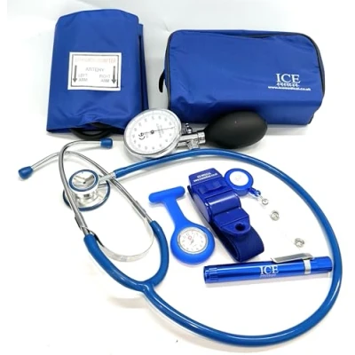 Aneroid Blood Pressure Sphygmomanometer Monitor, Stethoscope, Pen Light (Pen Torch), Tourniquet, Nurse Watch, Lanyard ID Card Holder Starter Set (Blue with Silicone Watch)
