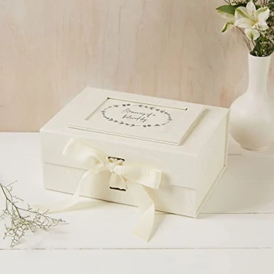 PERFECT FOR PRECIOUS MEMORIES OF YOUR DOG - This beautiful 'Memories of a Beloved Dog' Memory Box is the perfect place to store precious keepsakes and mementos of a much loved pet. Perfect for safekeeping treasured memories, the box is ideal for storing photos, documents, toys, collars and other special items. LUXURY DOG MEMORY BOX - Luxury memory box with ribbon The rigid ivory card box has a smooth, matt finish and features a magnetic snap-shut closure, beautifully finished with an ivory grosgrain ribbon bow. The lid features an ivory frame with a card insert featuring the words 'Memories of a beloved dog' inside a delicate floral wreath with paw prints. You can replace this card insert with a 6 x 4 photograph if you wish. CAN BE SENT WITH A GIFT MESSAGE - If you would like to send this memory box as a gift directly to the recipient along with a personal gift message, simply add the item to the basket, tick 'this item is a gift' and you'll be able to add a gift message at the checkout, then we will hand write it on a gift card and include it with your order. No pricing will be included. DIMENSIONS - Length 23.5cm x Width 17cm x Height 10cm (9.25 x 6.5 x 4 inches). EXCLUSIVE TO ANGEL & DOVE - Contemporary funeral and sympathy gifts designed to celebrate life, love and individuality