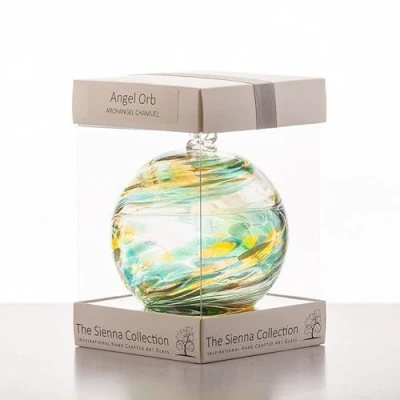 Handcrafted Excellence – Each angel orb is individually mouth-blown by skilled artisans, ensuring a unique and high-quality finish. Symbolic Green Fluorite Design – The delicate strands of green fluorite-coloured glass represent love and compassion, making it a meaningful keepsake. Versatile Display – Adorned with a satin ribbon, it can be elegantly hung in any room, bringing a sense of peace and harmony to your space. Perfect Size – Measuring 10cm in diameter, it's an ideal decorative piece for various settings. Thoughtful Gift Idea – Presented in a gift box, it's a unique and meaningful gift for loved ones seeking comfort and guidance.