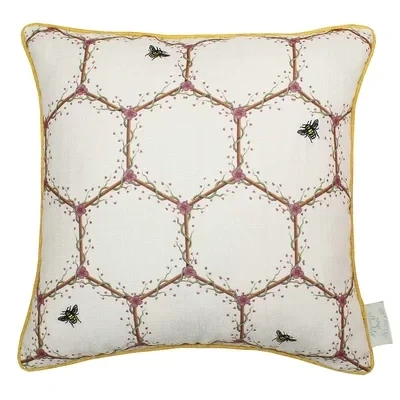 From the collection of cushions inspired by the renovated interior of the fairytale French Chateau made famous by the Channel 4 series 'Escape to the Chateau', this delightful cushion has an octagonal honeycomb trellis design, intertwined with delicate flowering vines and with happy bees embroidered between. It is finished with cheerful yellow piping and comes complete with a polyfibre cushion pad.