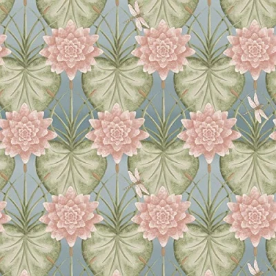 A stylish art deco pattern created with water lily flowers and leaves and highlighted with a dragonfly. Shown in a faded pink and green on an eau de nil blue colourway. Created to co-ordinate with many of the items from this favourite brand. Actual pattern repeat is 32 cm or 12.5 inches.