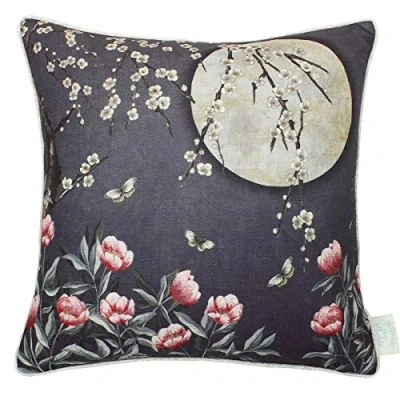 From the collection of cushions inspired by the renovated interior of the fairytale French Chateau made famous by the Channel 4 series 'Escape to the Chateau', this delightful cushion has an oriental inspired picture scene. Showing an enormous full moon with boughs of blossom and magnolia blooms, with pretty butterflies flitting between. There are three complementary colours available. It is finished with a pale grey piping and comes complete with a polyfibre cushion pad.