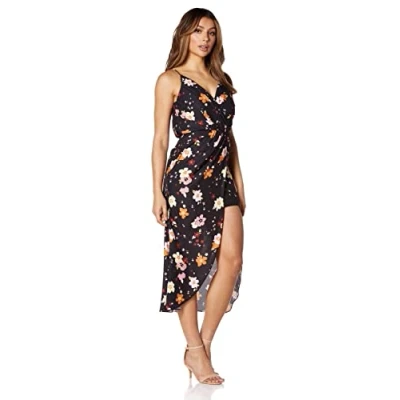 Angela Wrap V Neckline Midi Dress in Floral Print, Black UK 18