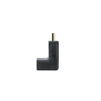 Angled HDMI adapter, designed to connect devices in tight spaces. Features a female male connector, ideal for preventing wear due bending of the cable.