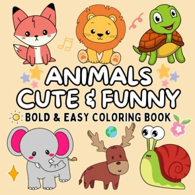 Animals Cute & Funny Bold and Easy Coloring Book: 50 Simple Designed Relaxing Stress Relief Illustrations for Kids Adults