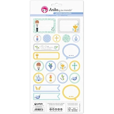 Pack of 5 sheets of 21 Communion stickers. The leaves have a weight of 225 grams. The dimensions of each sheet are 15 x 32 cm. These stickers belong to Anita's First Communion Child collection and their world scrapbooking.