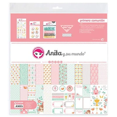 This scrapbooking kit contains 13 decorated papers, plates, stickers, sequins and a wahi tape from the First Communion Girl collection of Anita and her world. It also contains matching accessories: plates, stickers, pastel sequins and washi tape. This craft kit is perfect for creating photo albums, signature books, dedication notebooks, invitations and communion reminders. This manaulity kit belongs to Anita's First Communion Girl collection and her world scrapbooking.