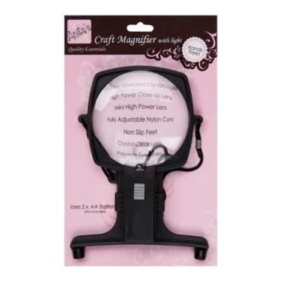 USE Perfect for ensuring the finer details of projects aren't missed! Must-have products for crafty stash. Features a stand for desk use, will help to make it easier to see when doing work IDEAL Helps to prevent eye strain when crafting. Great for anyone who strains their eyes to see words on a page or requires more focus. Use round the neck or as a desk magnifier. 2.5 magnifier lens for close-up vision. The view is large and clear FEATURES Portable magnifier comes with fully adjustable nylon cord and non-slip feet, compact design is convenient to carry around for multiple uses. Includes a useful light for working in dim conditions. Requires x2 AA batteries SUITABLE Pocket device is great for jewelry making, metal work, hand embroidery, reading, applying embellishments to crafts, sewing, cross-stitch, knitting, nail and beauty, applying a fake lash, and more MATERIAL Made of high quality plastic and acrylic optical lenses, providing a close simulation to natural light and easier viewing. Hands free design for ease of use when doing work or reading