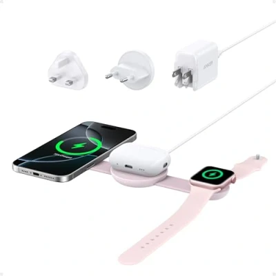 15W Fast Charging for iPhone and Apple Watch: Quickly power up your iPhone 15 Pro to 20% in 15 minutes and an Apple Watch Series 9 to 30% in 22 minutes with a certified and MagSafe-compatible wireless charger. Travel-Friendly and Ultra-Portable: Take the convenience of wireless charging anywhere with a foldable Qi2 wireless charger that's the size of a standard tennis ball. 3-in-1 Wireless Charger: Keep your workspace uncluttered with the Anker 3-in-1 charger that powers multiple devices simultaneously. StandBy Mode for Optimal Viewing: Improve your iPhone's usability with a charger that offers landscape viewing and supports StandBy mode when folded. What You Get: Anker MagGo Wireless Charging Station (3-in-1, Foldable Pad), 5 ft (1.5 m) USB-C to USB-C cable, 40W adapter with interchangeable UK, US, and EU plugs, welcome guide, 24-month warranty, and our friendly customer service.