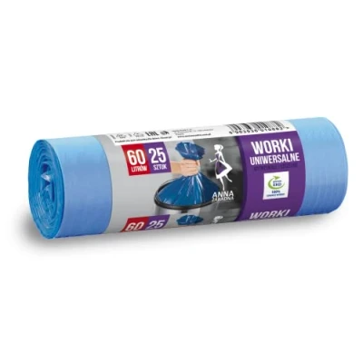 Anna Zaradna Universal Bin Liners, 60 L, Pack of 25, Blue Made from recycled film waste regranules recyclable Waste bags - for packaging all household waste and waste The bags have a so-called Star-shaped bottom seal, thanks to which the bottom of the bag is extremely tight and the bags fit perfectly into round waste bins Have practical handles that make it easier to tie the bags together and carry They are ideal for homes, offices, public places Fits in most waste bins Capacity: 60 litres. Colour: blue. Quantity: 25 pieces. ; Length: 70 cm; Width: 60 cm