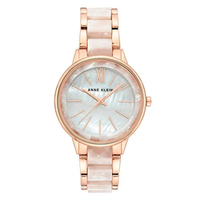 Slightly domed mineral crystal lens Mother-of-pearl dial with rose gold-tone hands and markers Rose gold-tone adjustable link bracelet with pearlescent white resin center links; jewelry clasp and extender Water resistant to 100 feet (30M)
