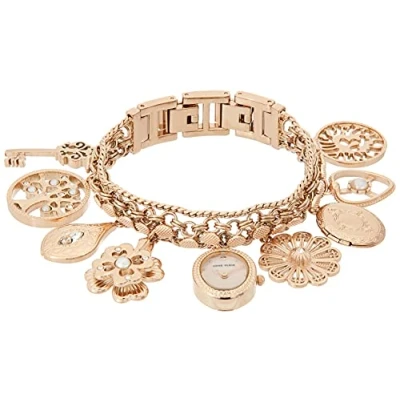 Slightly domed mineral crystal lens; rose gold-tone mother-of-pearl dial with matching hands and markers; rose gold-tone chain bracelet with jewelry clasp and extender Bracelet includes eight dangling charms featuring a key, leaf, tree, clover, flower, locket and heart Quartz Movement Case Diameter: 18mm Not water resistant