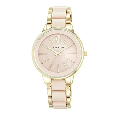 Slightly domed mineral crystal lens; blush pink mother-of-pearl dial with gold-tone hands and markers Gold-tone adjustable link bracelet with blush pink resin center links; jewelry clasp and extender band_width:16.0 millimeters. case_diameter:37.0 millimeters.water_resistance_depth:100.0 feet